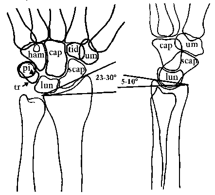 ham - os hamatum, pi - os pisiforme, tid - os trapezoideum, tr - os triquetrum, um - os trapezium