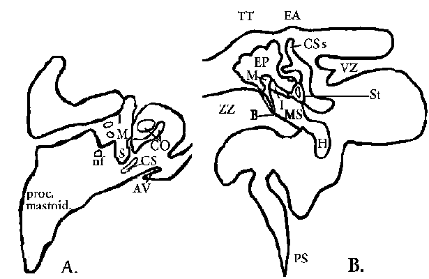 A. axilární rovina, B koronární rovina, St - stapes - třmínek, M - malleus - kladívko, I - incus - kovadlinka