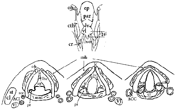 | Anatomie laryngu : pr - piriformní recessus, mml - mm. laryngis, lhe - lig. hyoepiglotticum, mih - infrahyoidní svaly : m. sternohyoideus, m. thyrohyoideus, m. sternothyroideus, m. omohyoideus, VJ - v. jugularis interna, ACC, ACI, ace - a. carotis com.,int.,ext., stcl - m. sternocleidomastoideus |