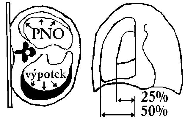 A - snímek vleže na boku, B - stupeň kolapsu plíce na 25 % a 50 % původního objemu