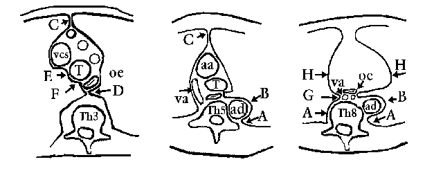 Axiální vrstvy - aa, ad - aorta ascendens, descendens, T - trache, vcs - horní dutá žíla, oe - jícen, va - v. azygos