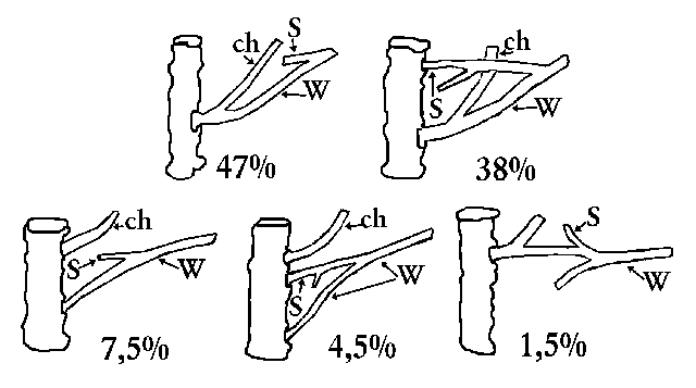ch - d. choledochus, W - d. pancreaticus major (Wirsung), S - d. pancreaticus minor (Santorini)