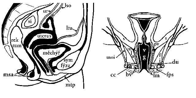 | bv-bulbus vestibuli, cc-crus clitoridis, fi-fossa ischio-rectalis, fps-fascia perinei superf., ltu-lig. teres uteri, lso-lig. suspensor. ovarii, lm-labium minus, pv-plexus uterovaginalis, ur-ureter, si - sigmoideum, s-prostor subperitoneální,vg-vagina |